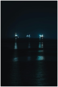 A serene night view of illuminated ships on the oc