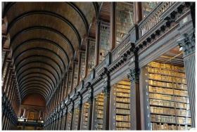 Expansive view of the historic Long Room library in Trinity College Dublin.