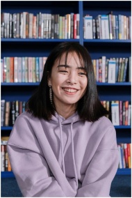 Happy teen girl in a purple hoodie sitting in a library with books in the background.