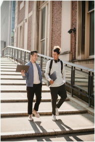 Full body of cheerful multiracial classmates with folder and laptop walking down staircase near university building