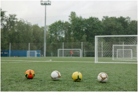 Four soccer balls on an outdoor field near goalposts, ideal for sports themes.