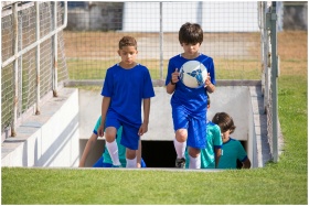 Children walking onto a soccer field during a sunny day, holding a soccer ball.