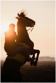 A dramatic silhouette of a person riding a horse rearing up against a stunning sunset backdrop.