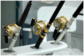 Detailed view of fishing rods with gold reels on a boat, ideal for angling enthusiasts.