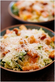 A mouth-watering Caesar salad topped with shredded cheese and golden croutons.