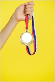 Close-up of hand holding gold medal with ribbon ag