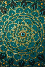 Detailed dot painting mandala artwork on teal background showcasing vibrant, intricate patterns.