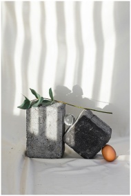 Minimalist arrangement of stones, an egg, and leaves on a white background with dramatic shadows.