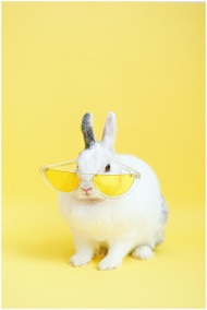 Adorable bunny wearing yellow sunglasses against a vibrant yellow backdrop, exuding cool and humorous vibes.