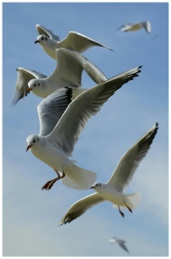 A flock of seagulls gracefully flying against a clear blue sky, showcasing their wingspan.