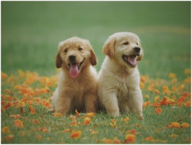 Adorable golden retriever puppies sitting in a fie