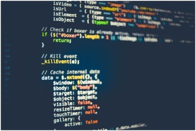 Close-up of colorful programming code displayed on