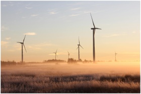 Wind turbines stand tall amidst a misty, sunrise landscape in Ontario, Canada, showcasing renewable energy.