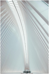 Interior view of the modern and bright Oculus terminal in New York City, showcasing futuristic design.