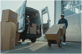 Two couriers load boxes into a van for shipment, showcasing logistics and teamwork.