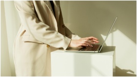 Woman in beige coat typing on laptop in a sunlit workspace, emphasizing modern work.