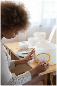 From above side view of talented African American female artisan sitting at table in creative workshop and paining picture on handmade ceramic bowl