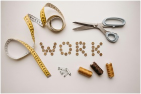 Flat lay of sewing tools and 'work' spelled out wi
