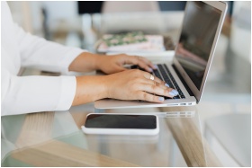 Close-up of hands typing on a laptop with smartpho