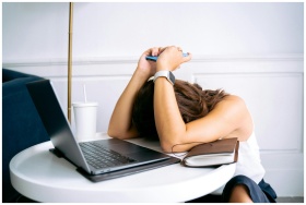 Young woman showing stress with laptop and phone a