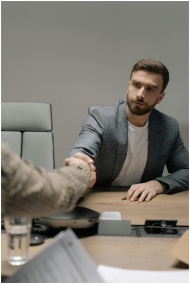 Two businessmen in a modern office shaking hands across a table. Professional setting.