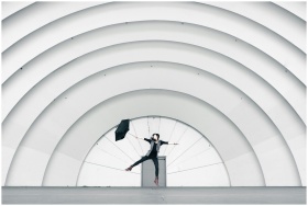 Person jumping joyfully under large architectural arches with an umbrella.