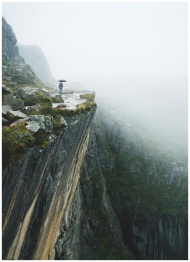 A person with an umbrella stands on a foggy mountain cliff, highlighting travel adventures.