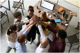 A diverse group of colleagues giving a high five during a corporate meeting indoors.