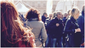 A lively group of people gathers in an outdoor setting during daytime.