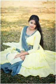 Portrait of a woman in traditional attire, sitting gracefully in a sunny park setting.