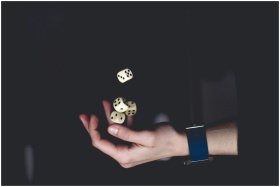 A close-up of a hand tossing several dice against a dark background, symbolizing chance and luck.