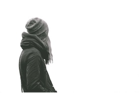 A woman in a winter jacket and beanie facing away