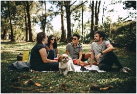 Friends having a fun picnic in the park with a Shi