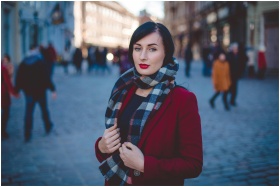 Young woman in red coat and plaid scarf standing i