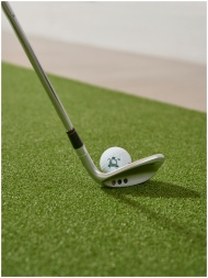 Close-up of a golf club and neon ball on a green t