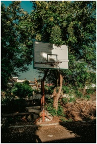 A rustic basketball hoop stands in a sunlit park surrounded by lush greenery and shadows.