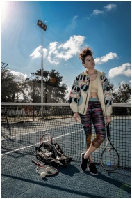 Stylish woman posing on outdoor tennis court with racket and gear under blue sky.