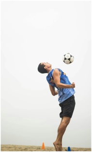 A young man dynamically performs a soccer trick outdoors, emphasizing speed and agility.