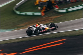 Exciting Formula 1 race car speeding on São Paulo circuit, capturing the thrill of motorsport.