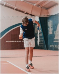 A young tennis player prepares to serve the ball on an indoor court, showcasing focus and technique.