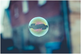 A single soap bubble reflecting buildings in an urban setting with a blurred background.