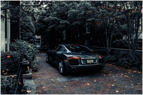 A sleek Audi R8 parked in a leafy residential driveway in Cape May, NJ, showcasing elegance and luxury.