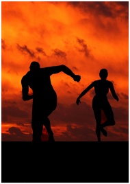 Silhouettes of male and female runners in action against a dramatic orange sunset.