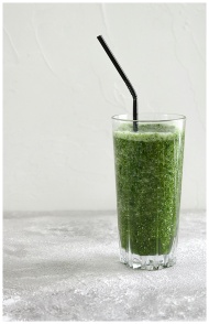 A healthy, refreshing green smoothie served in a tall glass with a black straw, against a minimalist background.