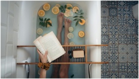 A tranquil bathtub with citrus fruits, book, and self-care essentials for relaxation.