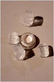 Flat lay of a skincare product surrounded by ice cubes on a textured surface.
