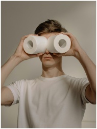 Man using toilet paper as binoculars, displaying h