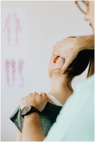 A female patient receives a chiropractic neck adjustment in a medical office for pain relief.