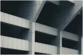 Abstract modern building facade showcasing geometric architectural design and patterns.