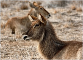 Two waterbucks lying in the dry grasslands of South Africa, showcasing their natural habitat.